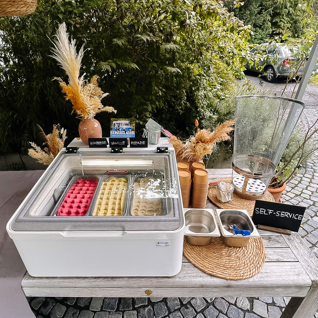 Ob als Ergänzung zum Buffet, Highlight im Lounge-Bereich oder als Self-Service-Station: Unsere Eistheke ist die perfekte Wahl für kleinere Events oder individuelle Catering-Konzepte. Sie lässt sich flexibel integrieren, bietet Platz für verschiedene Sorten und sorgt für besondere Genussmomente – ganz unkompliziert und stilvoll serviert.